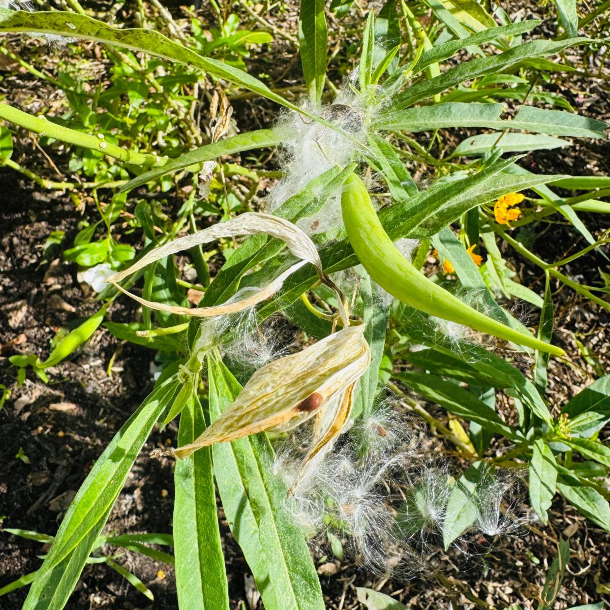 Bees, like the butterfly, travel through air and space to pollinate the flowers while leaves and roots grow with earth nutrients, sun and water to feed future caterpillars. Later, seed pods are formed that will release wisps of feathery seed clusters that blow in the wind to eventually make landing with soil to call home.